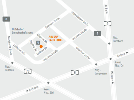 mit Auto: Ab Stadtmitte über Münchener Straße oder Regensburger Straße oder über die Autobahn A73, Ausfahrt Nürnberg Zollhaus, die Autobahn A6, Ausfahrt Nürnberg Langwasser oder die Autobahn A9, Ausfahrt Nürnberg Fischbach.
